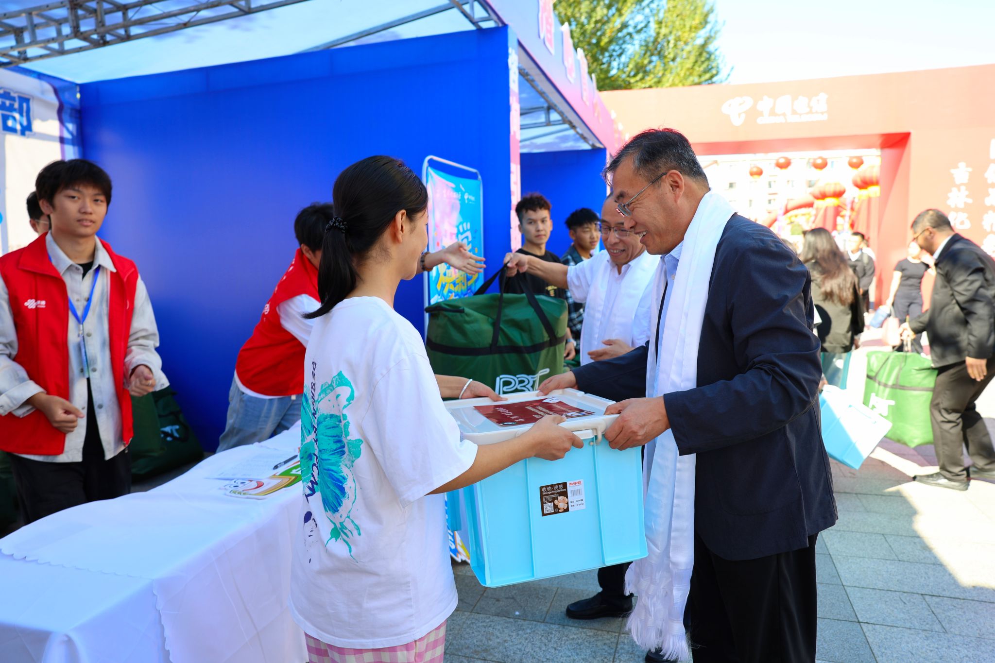 张明耀、艾学忠为新生代表送上爱心大礼包,传递学校的关怀与期许。